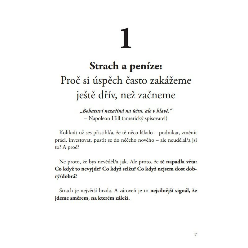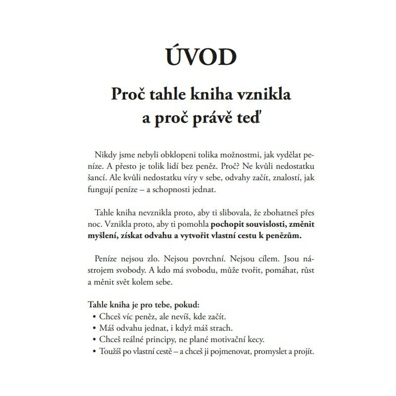 Tahle kniha tě provede vším, co tě ve škole nenaučili: od vztahu k penězům, sebevědomí a odvahy začít, přes finanční gramotnost, tvorbu hodnoty, až po skutečné principy pasivního příjmu.