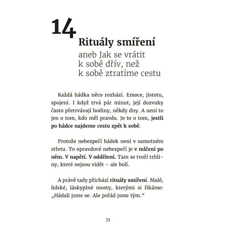 Naučíte se rozpoznat spouštěče, používat „já-věty“, domluvit si STOP-slovo, zvládat digitální hádky i hledat cestu zpět pomocí rituálů smíření. Hlavní část knihy tvoří Desatero, díky kterému se z každé hádky může stát dialog místo války. Prakticky, stručně, s humorem a respektem – aby doma bylo méně napětí a více blízkosti.