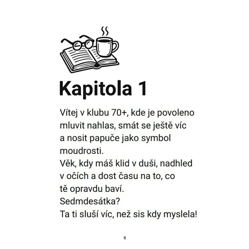 70 a klid v duši – Příručka přežití ženy, která má vše (hlavně nadhled). Hledáte dárek pro úžasnou ženu k jejím 70. narozeninám? Tohle není obyčejná kniha. Je to vtipně psaný, srdcem laděný a láskou nabitý průvodce životem, ve kterém hraje hlavní roli – ona sama.