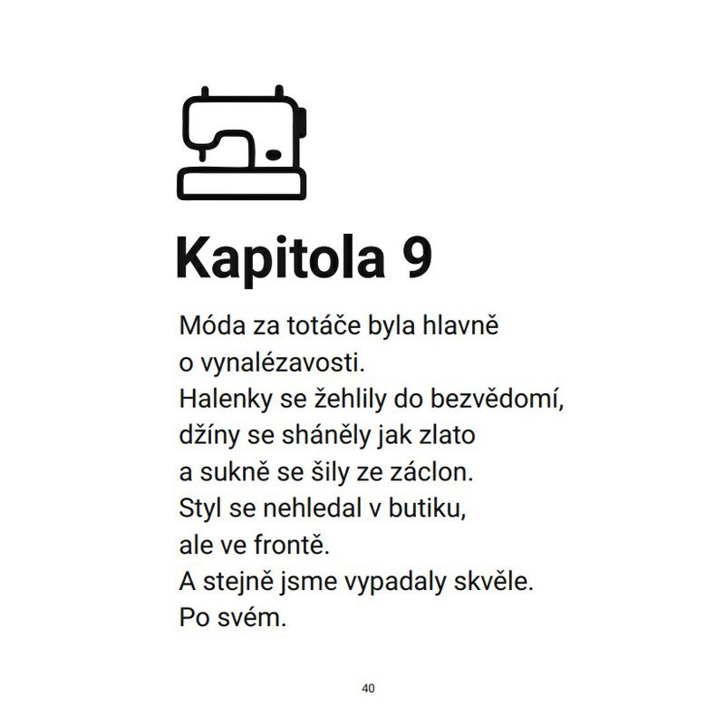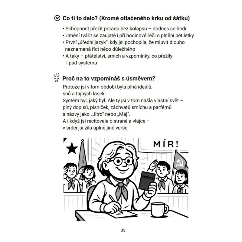 Kniha plná retro vzpomínek, humorných postřehů, upřímnosti a špetky rebelie. Od dětství v sukni a pískovišti přes první lásky a pionýrské šátky, až po babičkovský level se sušenkou v kapse a klidem na duši.